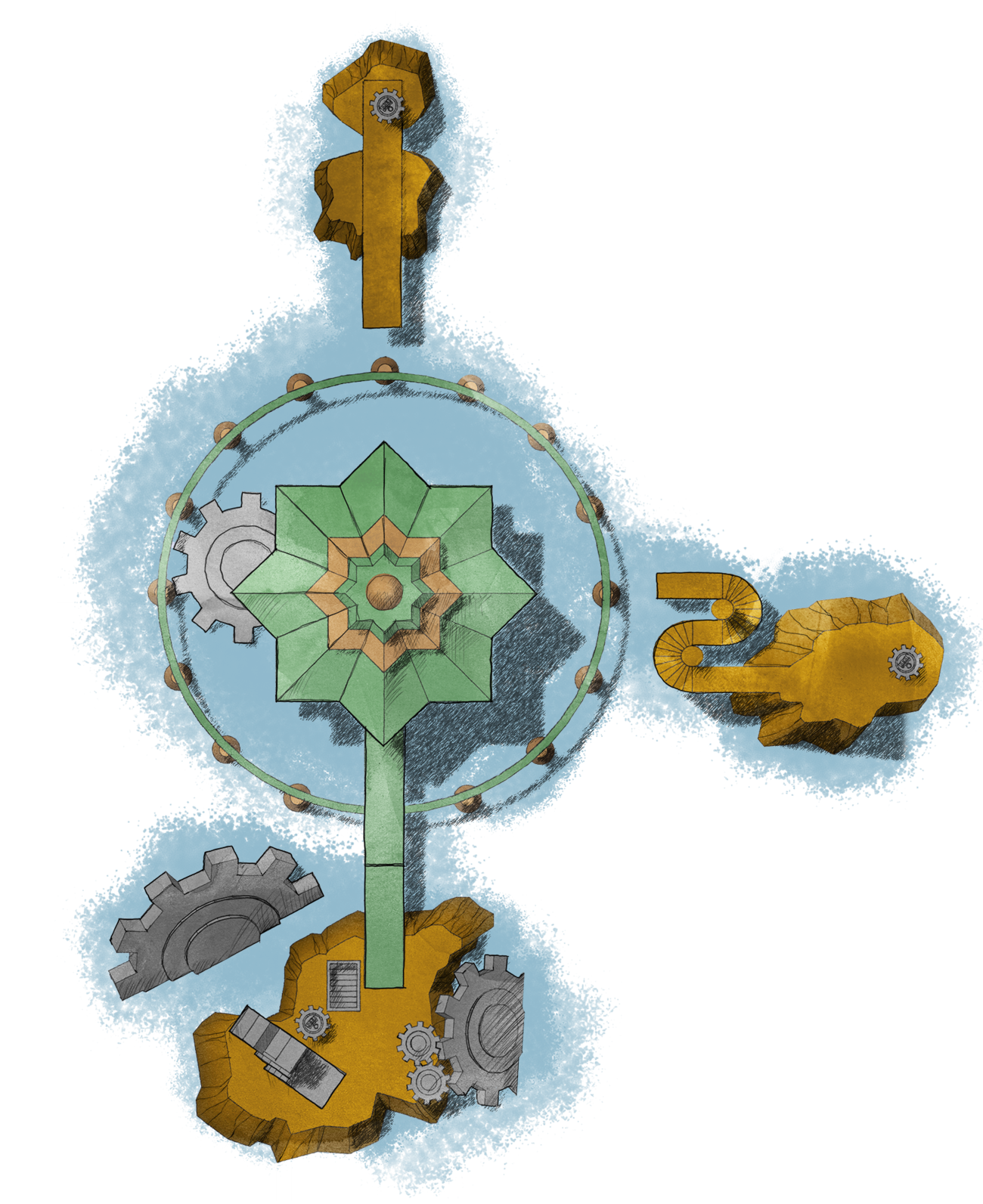 Outside the tree border, there is a small island with a windmill on it. Inside there was a large water tank and a valve. After turning the valve, I can hear the sound of water running inside the pipes. At a lot of walkway crossings there is a valve to let the water flow in either direction. The water in turn powers different machines that gives power to an elevator for instance.