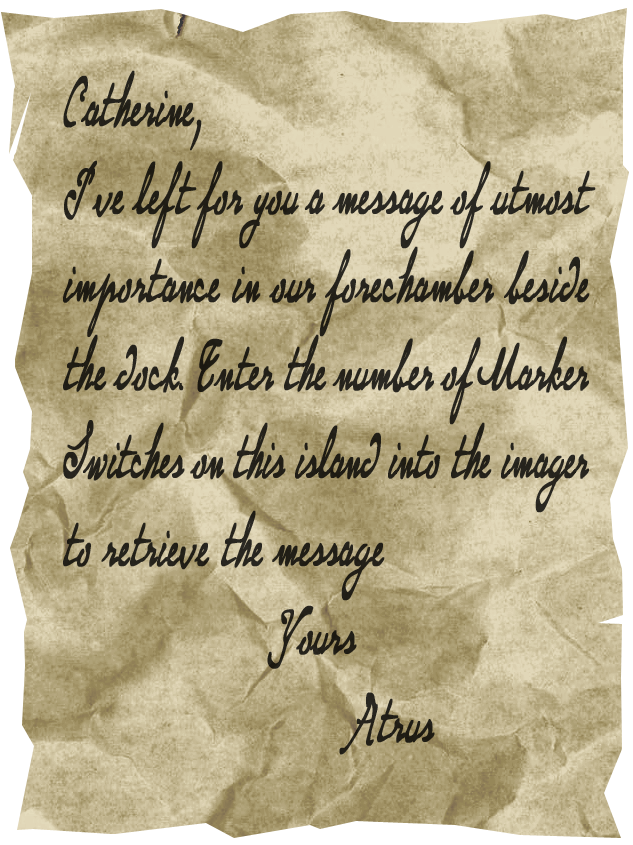 I wonder what has happened... It seems obvious that Catherine didn’t get this message since it wasn’t deleted. But where is she then? And where is Atrus? And what is the “tower rotation”? This has been a long day and I will go to the cabin and get a good nights sleep now. Hopefully tomorrow will be a day of answers, not more questions.