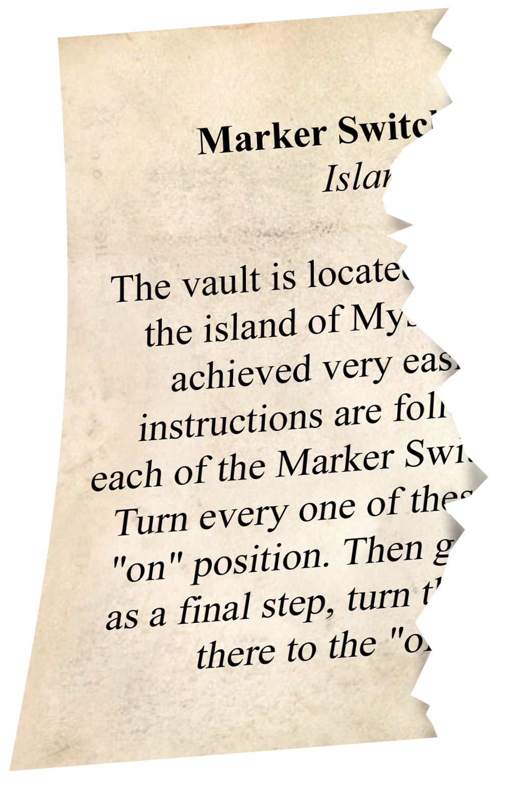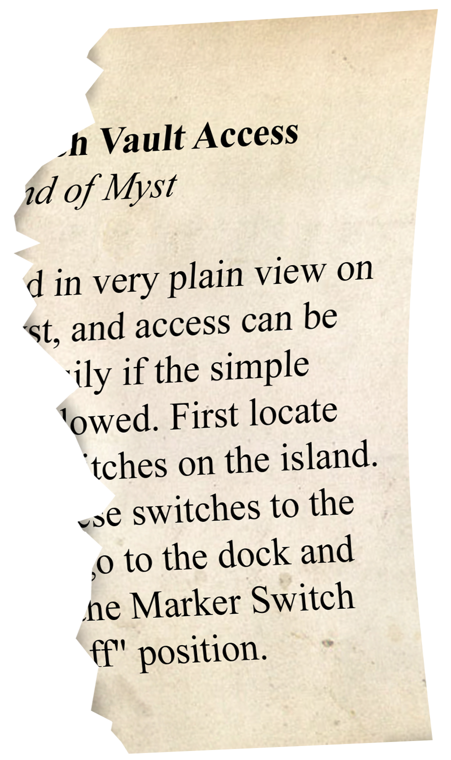 The vault is located in very plain view on the island of Myst, and access can be achieved very easily if the simple instructions are followed. First locate each of the Marker Switches on the island. Turn every one of these switches to the "on" position. Then go to the dock and as a final step, turn the Marker Switch there to the "off" position.