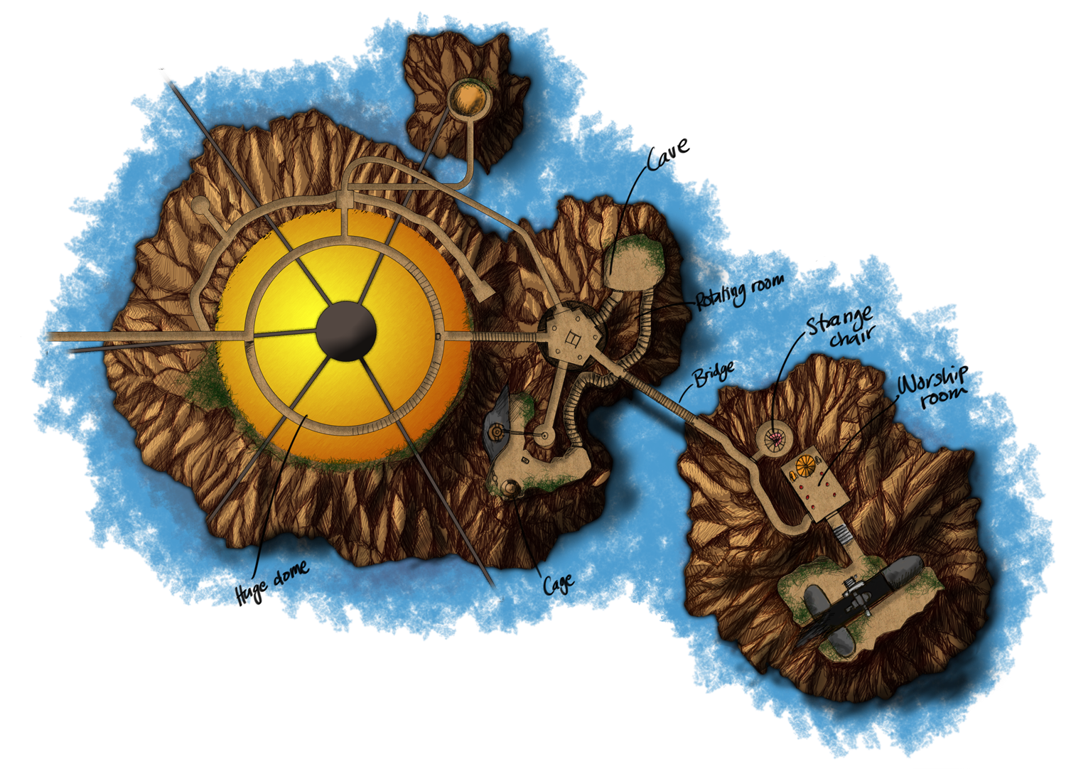 There is another one of the spinning domes on this island as well. As I climbed up I realized the structures below make up a map of all of the islands. There is a control panel that is the shape of all the islands, as they must have fit together before the instability tore them apart. When I press a shape, the structure fills with water that balloons out. It is truly a sight to behold.