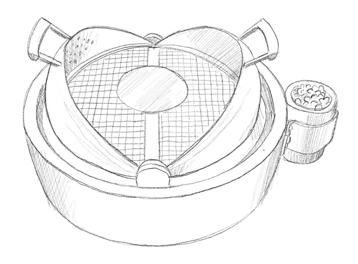 The building itself is interesting. Heavy double doors open to a metal catwalk that ends at a small device. It appears to be a pressure trap. There are brown food pellets that are light enough not to spring the trap, but the lightest touch seems to cause the dome to shut. Once I returned to the valve and directed power towards the cliff, I was able to lower the device into the cavern below.