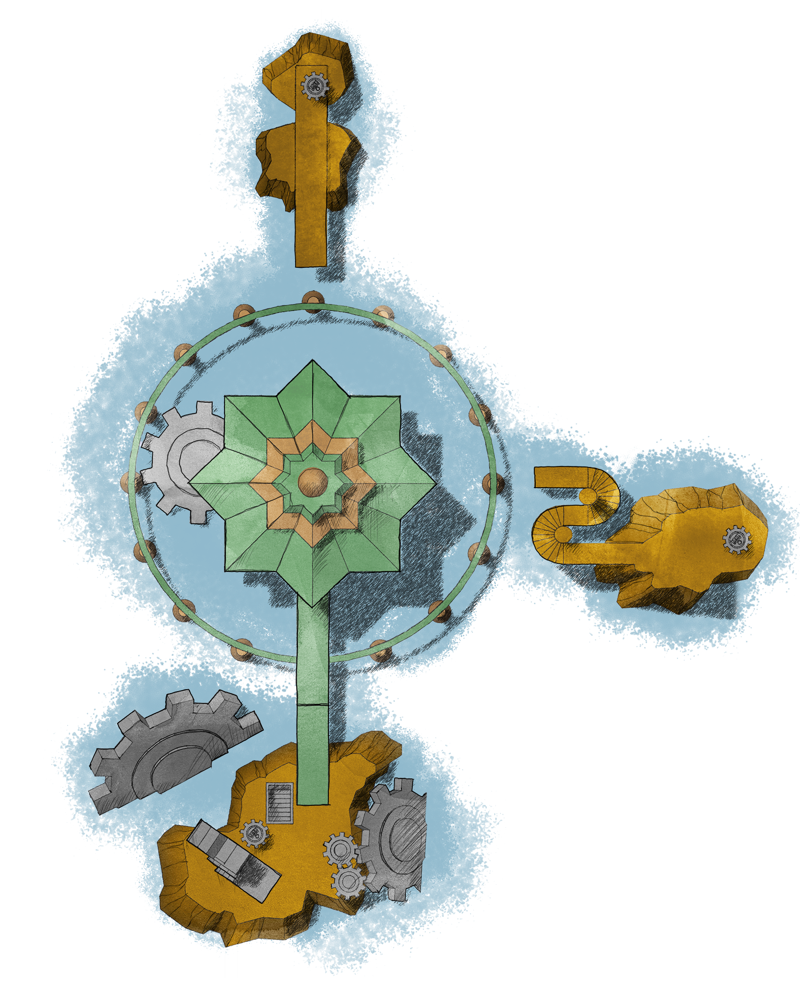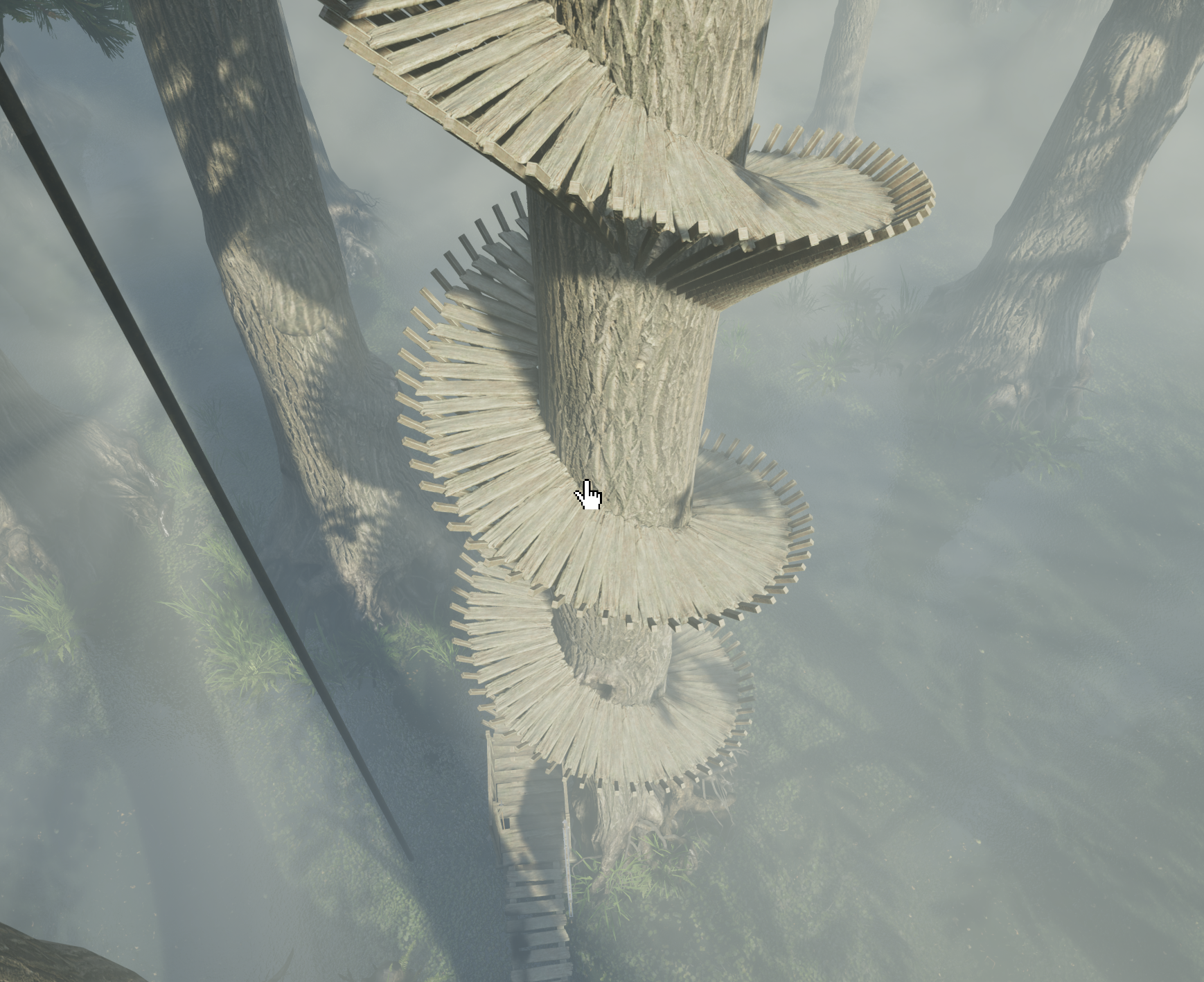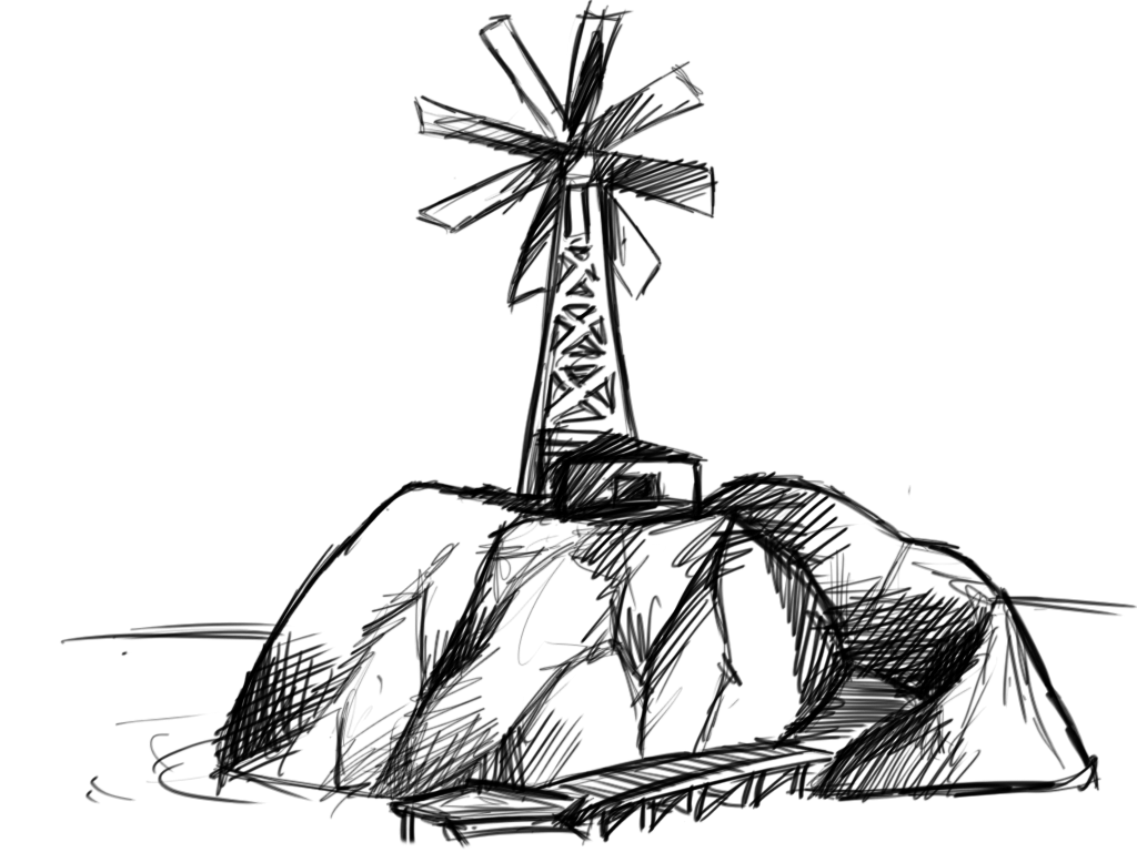 Outside the tree border, there is a small island with a windmill on it. Inside there was a large water tank and a valve. After turning the valve, I can hear the sound of water running inside the pipes. At a lot of walkway crossings there is a valve to let the water flow in either direction. The water in turn powers different machines that gives power to an elevator for instance.