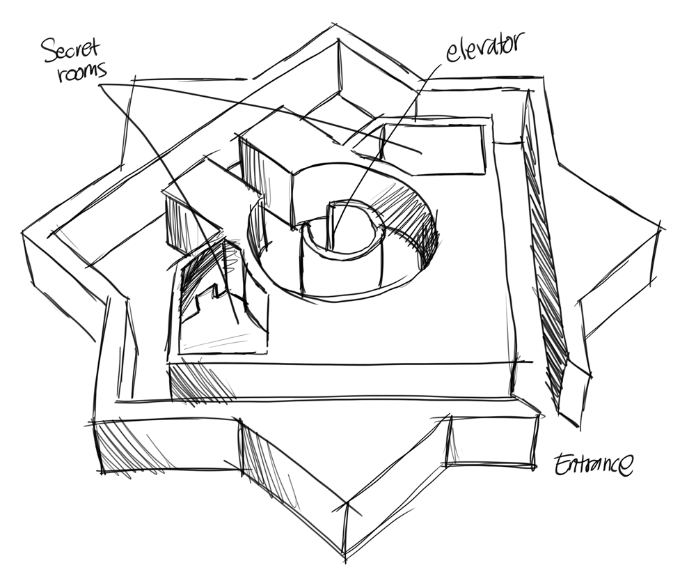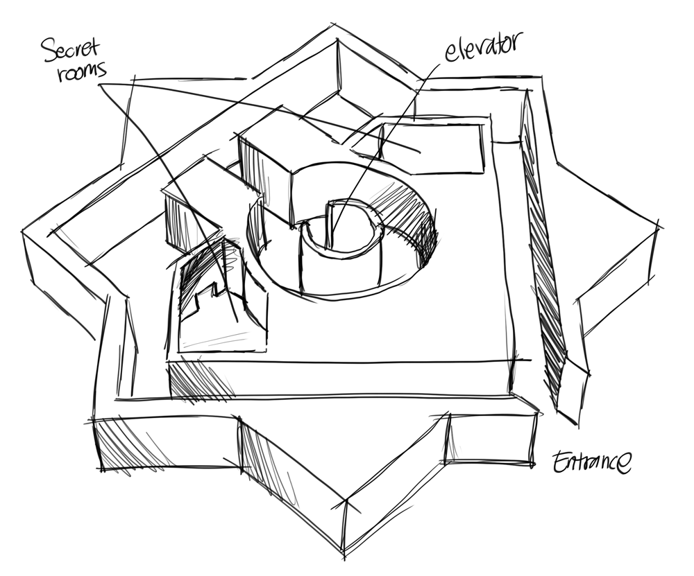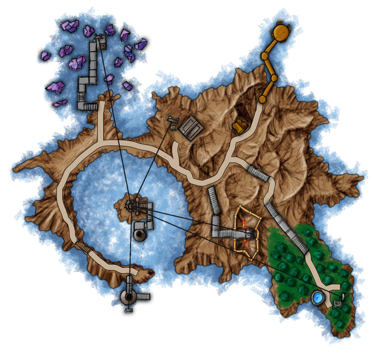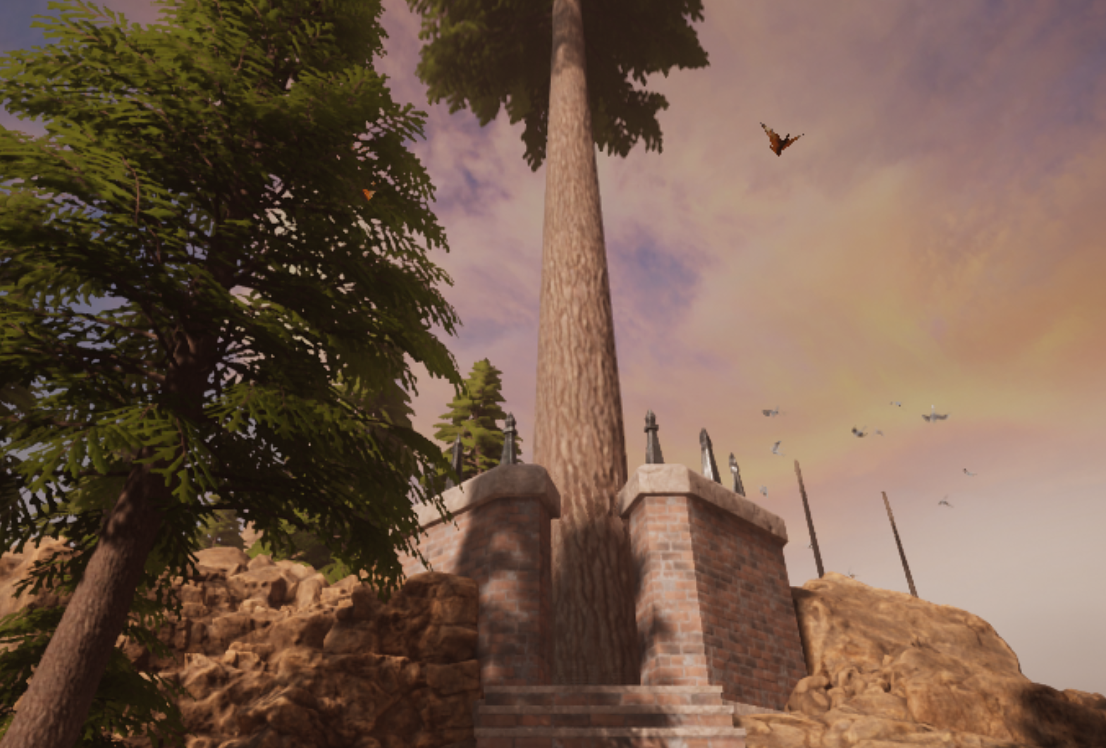 Outside the tree border, there is a small island with a windmill on it. Inside there was a large water tank and a valve. After turning the valve, I can hear the sound of water running inside the pipes. At a lot of walkway crossings there is a valve to let the water flow in either direction. The water in turn powers different machines that gives power to an elevator for instance.