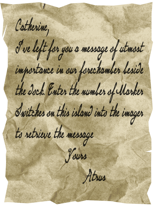 I wonder what has happened... It seems obvious that Catherine didn’t get this message since it wasn’t deleted. But where is she then? And where is Atrus? And what is the “tower rotation”? This has been a long day and I will go to the cabin and get a good nights sleep now. Hopefully tomorrow will be a day of answers, not more questions.