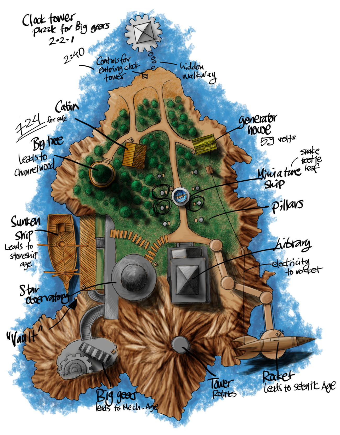 Moving on! Back to the clues from the tower rotation. Moving the line to the big gears, the clue was “2:40” and “2, 2, 1”. The only thing on this island that could relate to time is the clock tower, so I set the time to 2:40 by using the controls on the shore. A pathway opened and I could get inside the clock tower. It’s a puzzle inside and it’s obvious that the gears should read 2, 2 and 1. I took some time to figure out that the middle gears continues to spin if I hold the lever, but when I had it done, the big gears by the docks had opened. I am assuming the book inside leads to Mechanical Age. I will go there in the morning, but right now I really need some sleep.