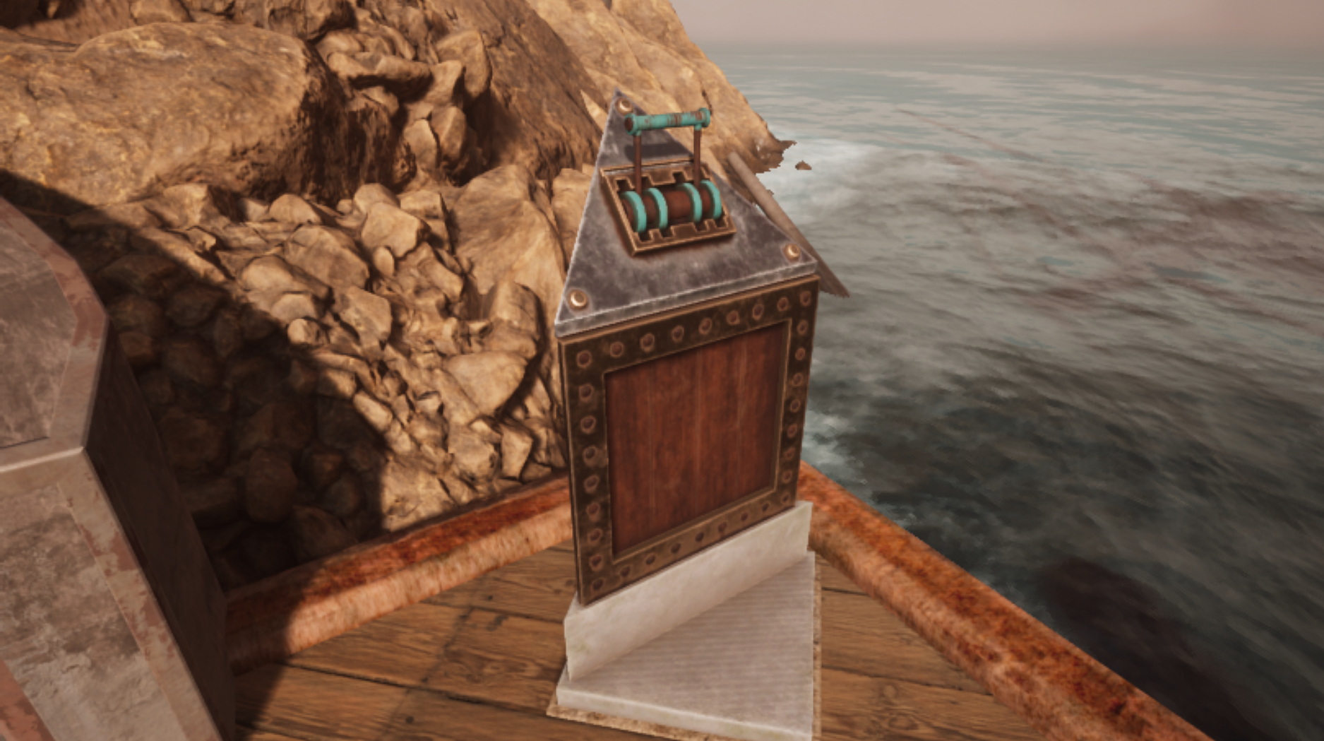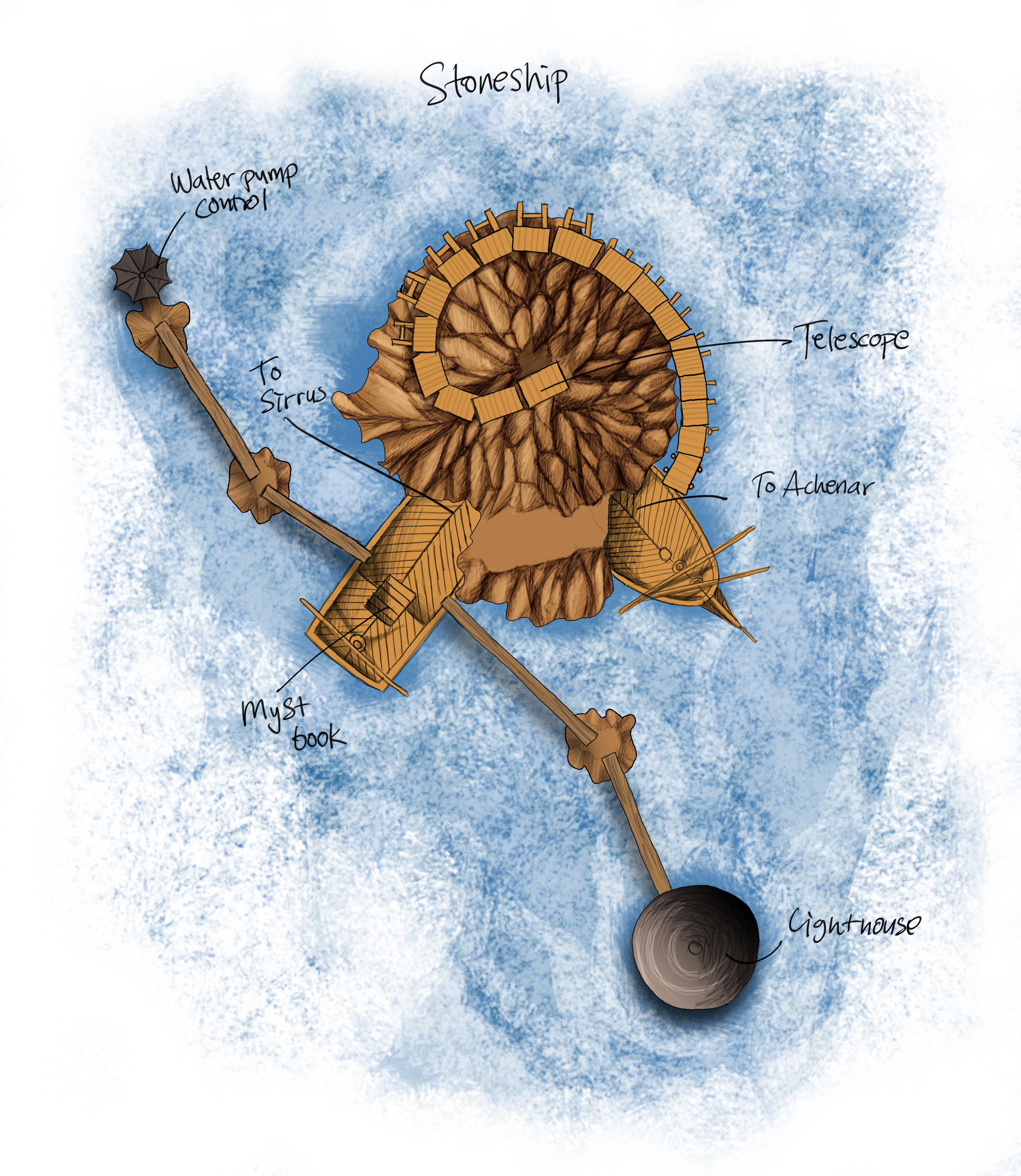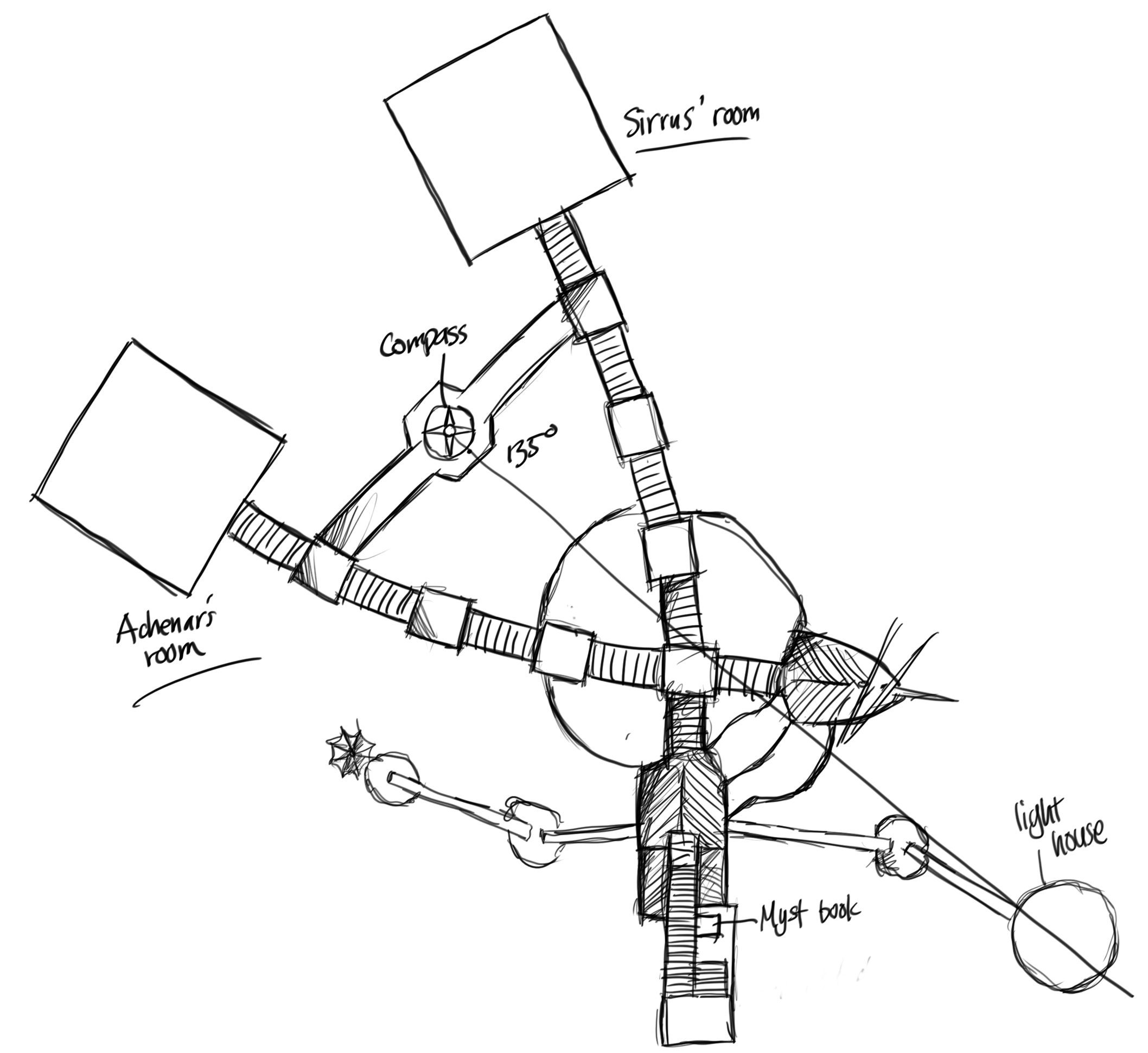 This age seems as small as Mechanical Age, but is even more weird... There is a huge ship that’s wedged solid into a huge rock, and at a weird angle. Hard to explain... I’ll draw a map of this place. Each “side” of the boat has an entrance, and there is an entrance in the back of the boat as well. In the house there is a generator (after you’ve found the key, which was an ordeal ) that you can turn to generate power, and then direct the power to each door with the switches. At the top of the rock is a small telescope but the thick mist makes it impossible to see anything. The entrance down the boat is pitch black and I don’t want to fumble around in the dark, so I focused on the other entrances first. Both leads down to rooms belonging to Achenar and Sirrus respectively. Both rooms are beautiful in their own right. Sirrus’ room is luxurious while Achenar’s is more brutal.